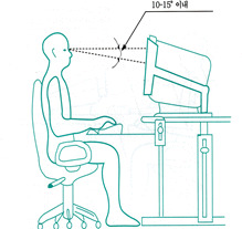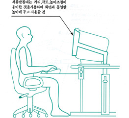 1. 영상표시단말기 취급근로자의 시선은 화면상단과 눈높이가 일치할 정도로 하고 작업 화면상의 시야는 수평선상으로부터 아래로 10도 이상 15도 이하에 오도록 하며 화면과 근로자의 눈과의 거리(시거리: Eye-Screen Distance)는 40센티미터 이상을 확보할 것